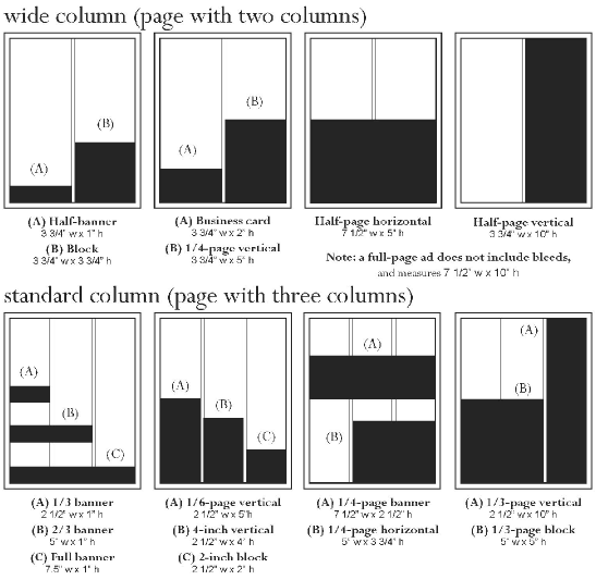 Mechanical Requirements All dimensions are listed width by height. Measurements given are maximum outside dimensions. Please furnish advertisements in electronic format when possible, as JPG, PDF, EPS, or TIFF, at 300ppi at 100% print size. Native files are accepted in PageMaker 6.5 or later, InDesign, Illustrator, Photoshop, Word, or file types readily convertible using thse programs. Do not send Publisher files. Scan-ready hard copy may also be sent. (Photocopies may be used, but as with all hard copy, quality of scan will depend on quality of the original submitted.) We will do limited production work, free of charge, to create an ad for use in The Ester Republic. Sizes shown below are standard sizes only. Other sizes may be purchased, using the following column widths only: For three-column pages, widths available are 7.5", 5", or 2.375". For two-column page, widths available are 7.5" or 3.75". Heights are available in increments of 1", with a minimum height of 1". Maximum height is 10".